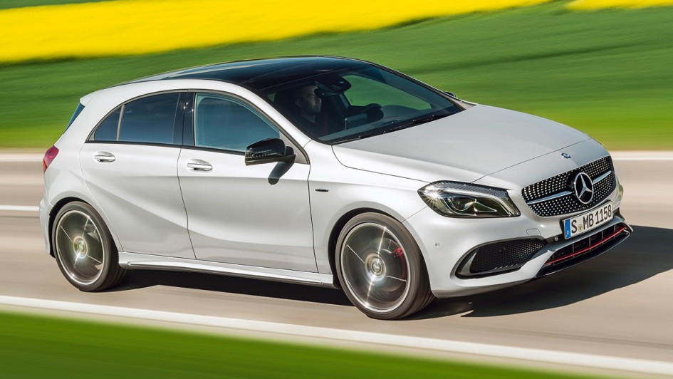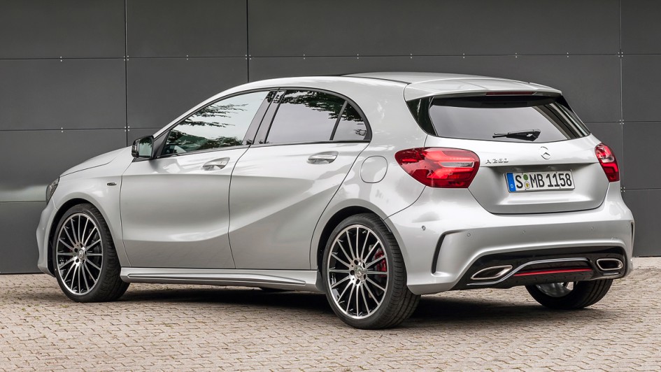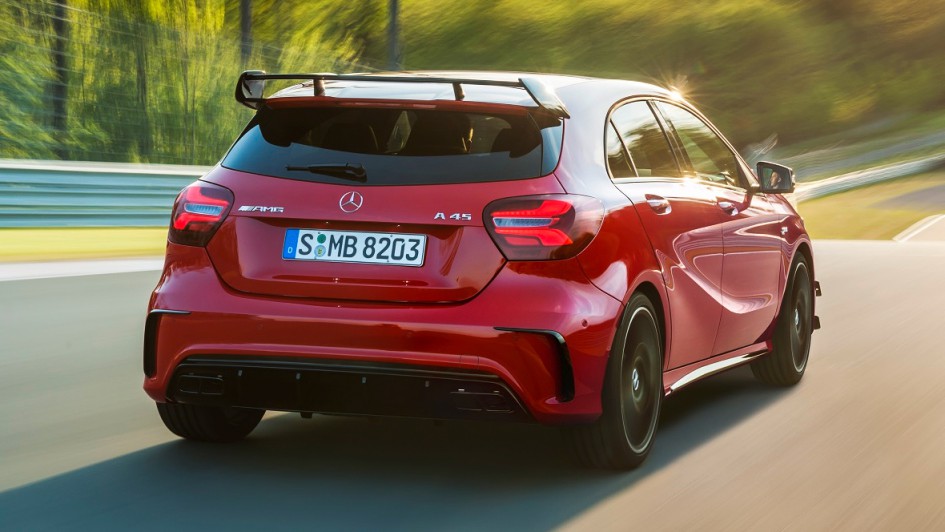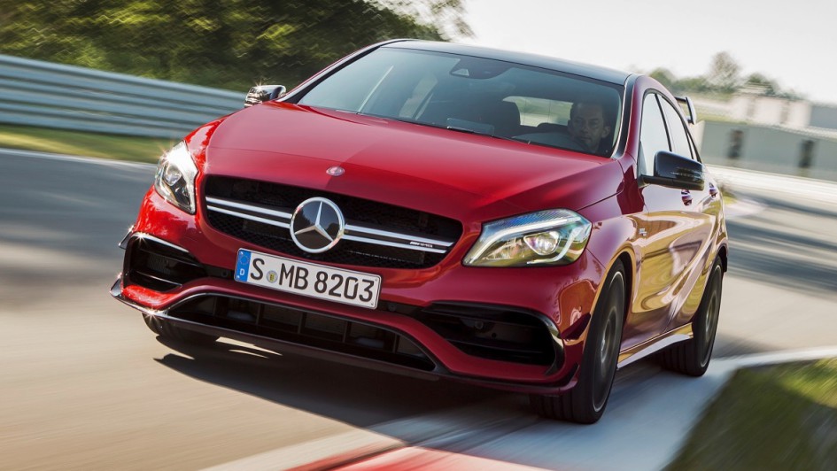 von 10: Der auch äußerlich erkennbare Ballermann mit dem langen Namen Mercedes AMG A 45 4matic wird von einem Zweiliter-Turbo und 280 kW / 381 PS befeuert.