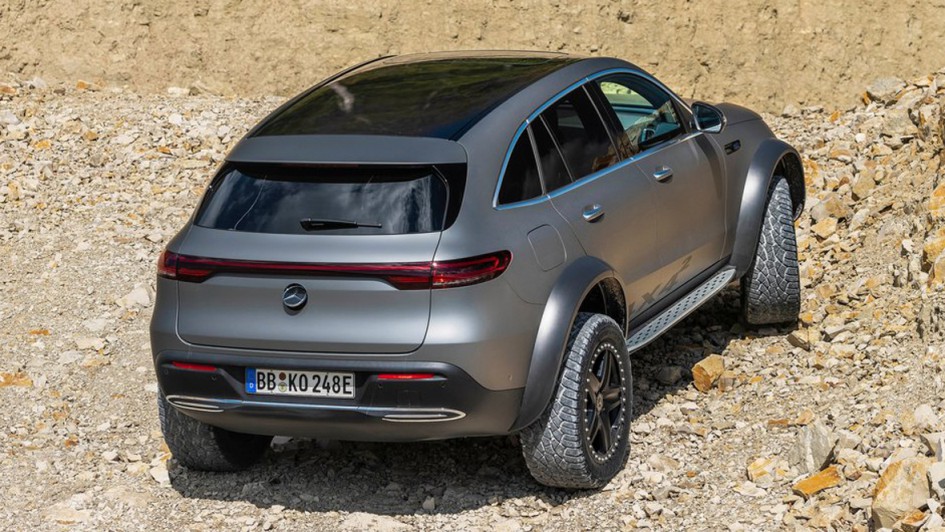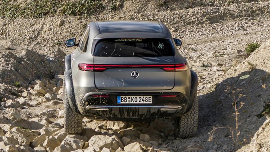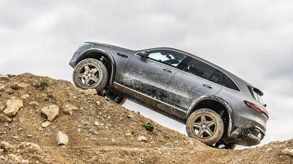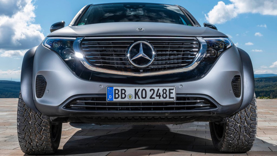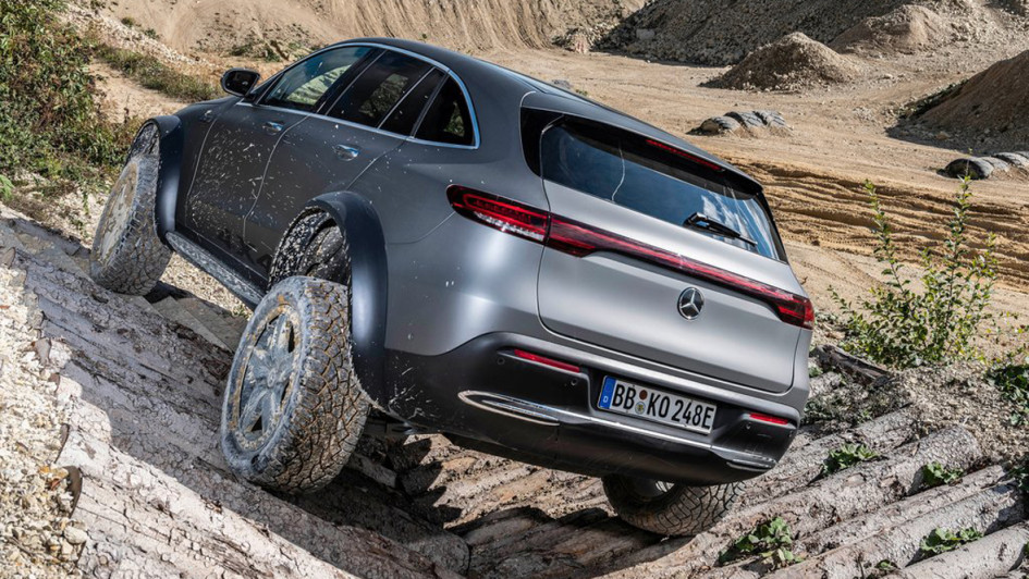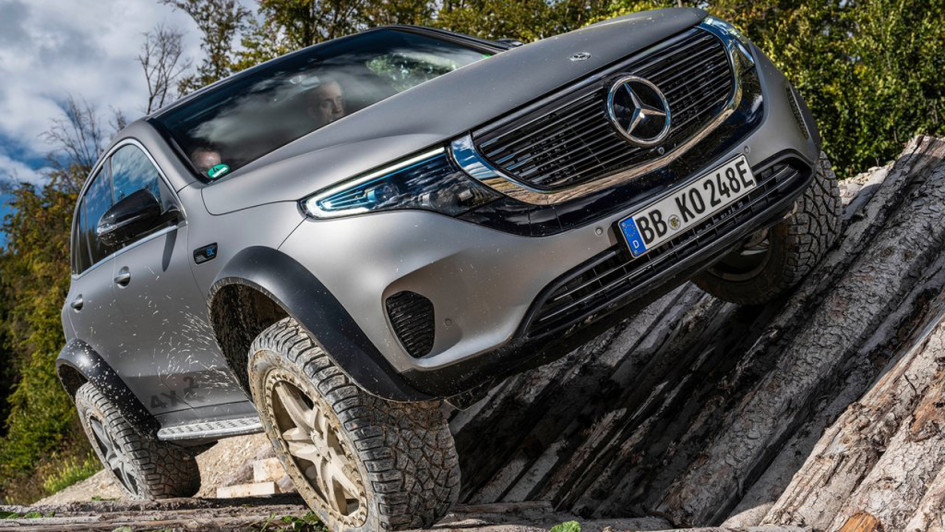 von 9: Um zu beweisen, dass auch elektrische SUV sehr wohl fürs Gelände taugen, hat Mercedes-Benz den EQC zum 4x4 hoch 2 aufgerüstet, Stollenräder inklusive.
