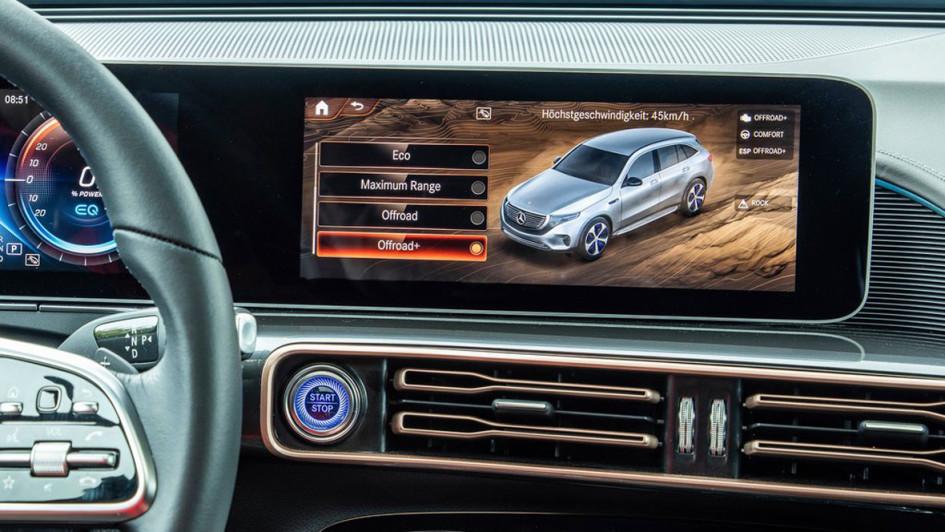 von 9: Zwar ändert sich am Antrieb nichts, es bleibt bei den zwei E-Motoren mit jeweils 150 kW und 370 Nm. Doch dank der verbesserten Offroad-Geometrie kommt der EQC in Matsch und Modder fast genauso weit wie die G-Klasse, die an Hindernissen sogar früher aufsitzt und im Wasser schneller absäuft, berichten die Ingenieure stolz.