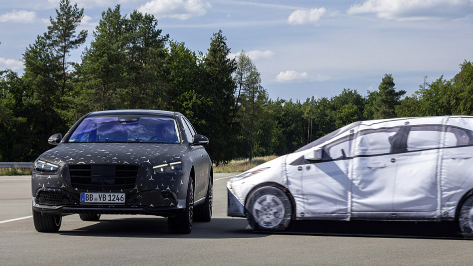 von 5: Droht eine seitliche Kollision, bockt sich die S-Klasse selbst auf. Bis zu acht Zentimeter kann die Karosserie angehoben werden. Damit soll die Aufprallenergie auf steifere Fahrzeugstrukturen gelenkt werden.