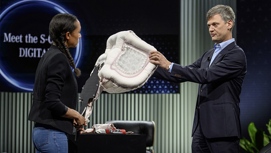 von 5: Michael Hafner, Leiter Automatisiertes Fahren, zeigt bei der digitalen Präsentation der neuen Sicherheitstechnik der S-Klasse den neuen Fondairbag, dessen röhrenartiges Außenskelett hart aufgeblasen wird, während die Mitte flexibel bleibt.