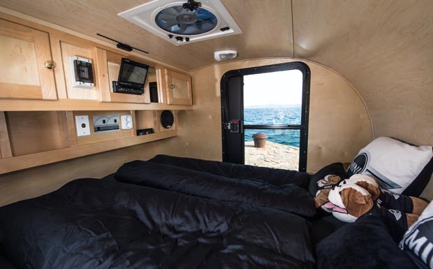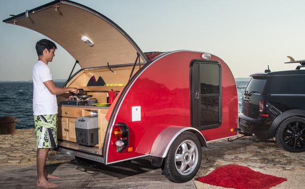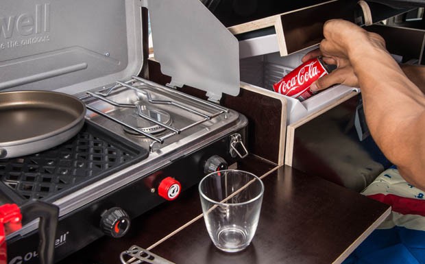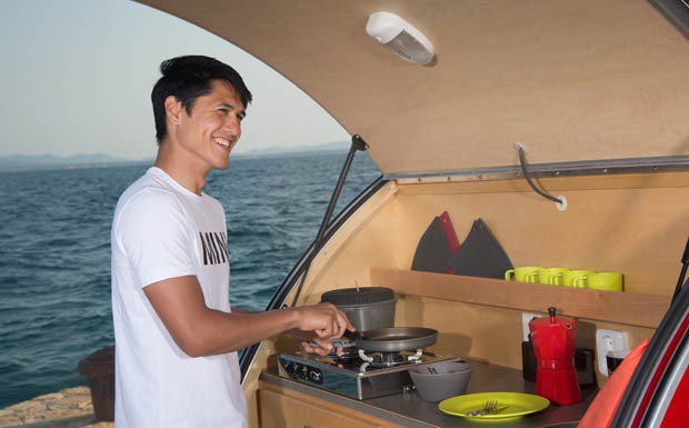 von 16: Es gibt einen zweiflammigen Gaskocher, einen Wassertank samt Pumpe und Spülgelegenheit, ein Solar-Modul zum Aufladen der bordeigenen Akkus und ein 230-Volt-Stromanschluss...