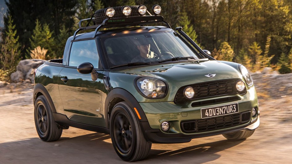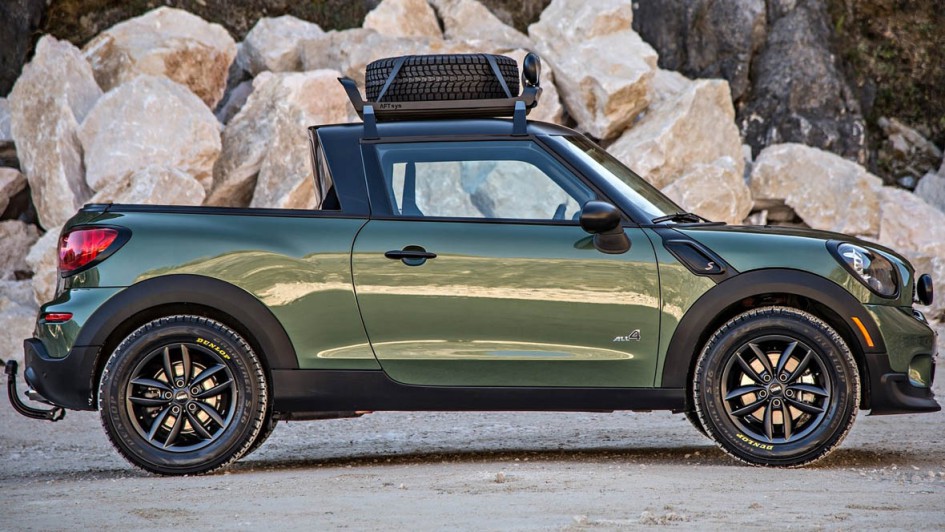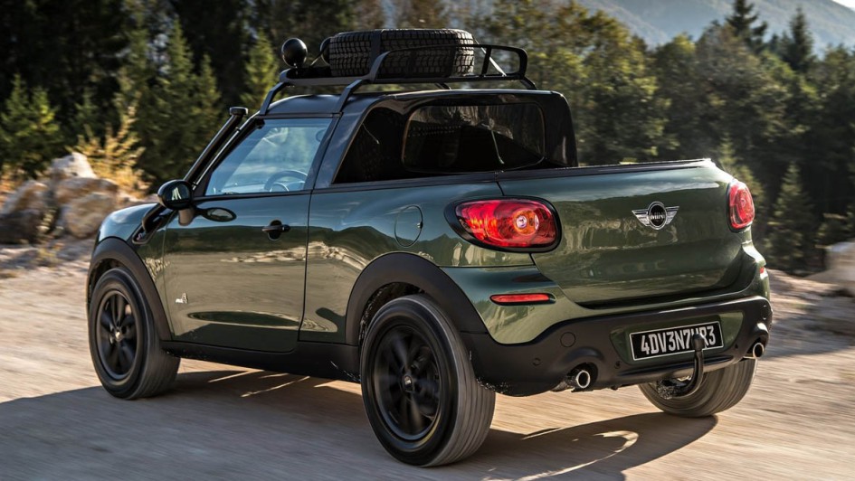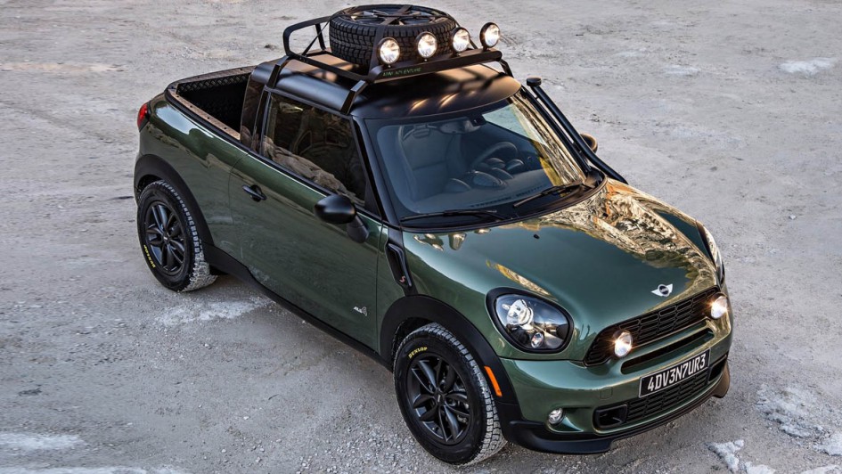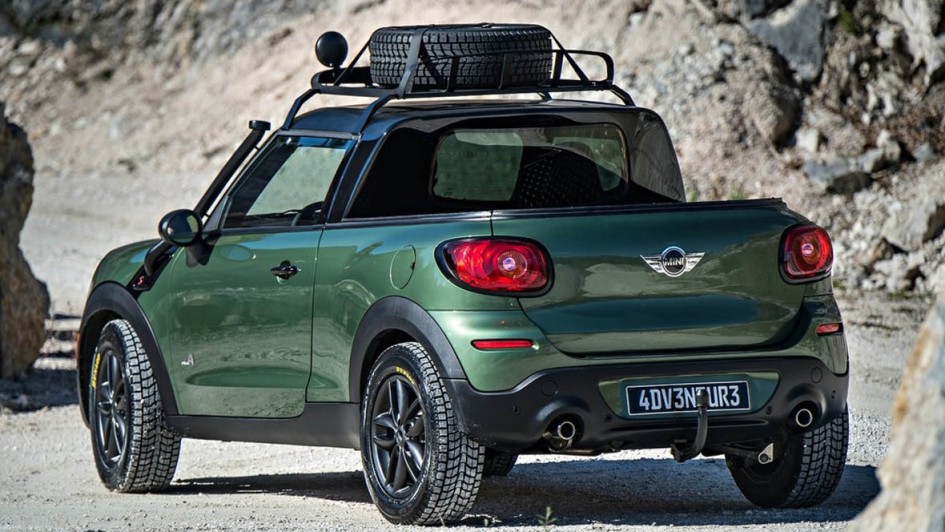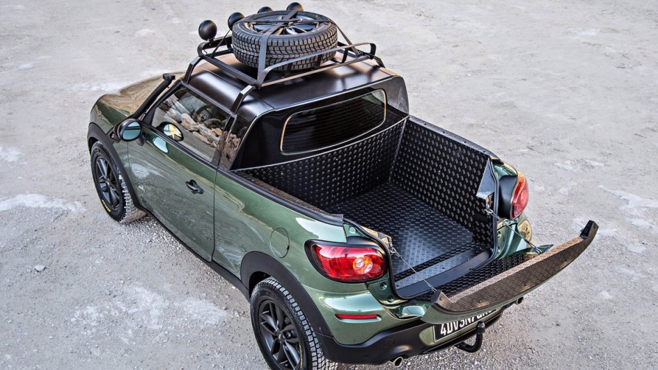 von 10: Hinter den zwei Sitzplätzen befindet sich die Ladefläche und auf dem Dach des grünen Kleinwagens thront ein Träger samt Ersatzrad und vier Zusatzscheinwerfern.