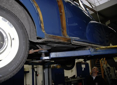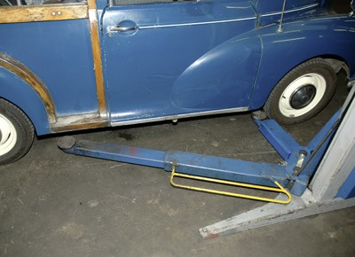 von 16: Aufnahme eines Morris Minor Traveller mit hinterem Karosserieaufbau in Holz. Zunächst werden die Tragarme in Ausgangsposition gebracht.