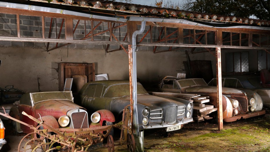 von 7: Die Autos waren in Unterständen untergebracht (mittig ein Facel Vega Excellence, hinten ein Talbot Lago T26 Cabriolet Saoutchik), die die Fahrzeuge mehr oder weniger gut schützten.