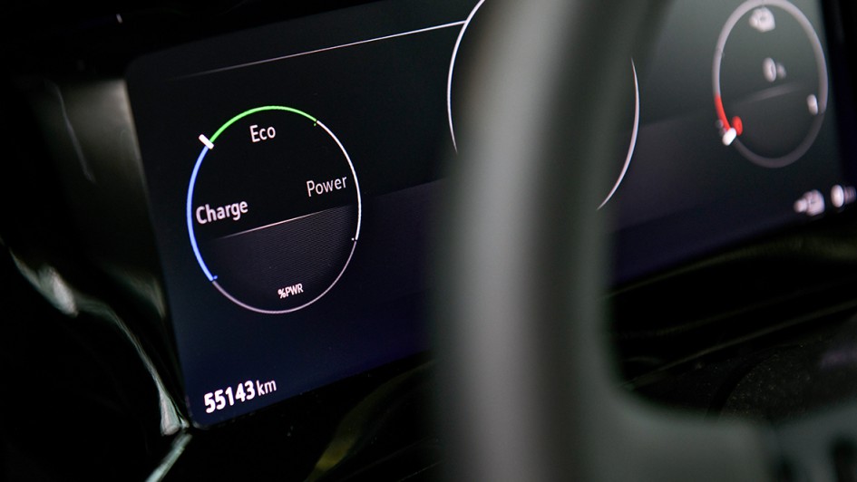 von 10: Die analogen Uhren wurden durch eine Kombination aus zwei Widescreen-Displays ersetzt (12 bzw. 10 Zoll), die neben den Standardanzeigen auch Ladezustand der Batterie und Reichweite verraten.