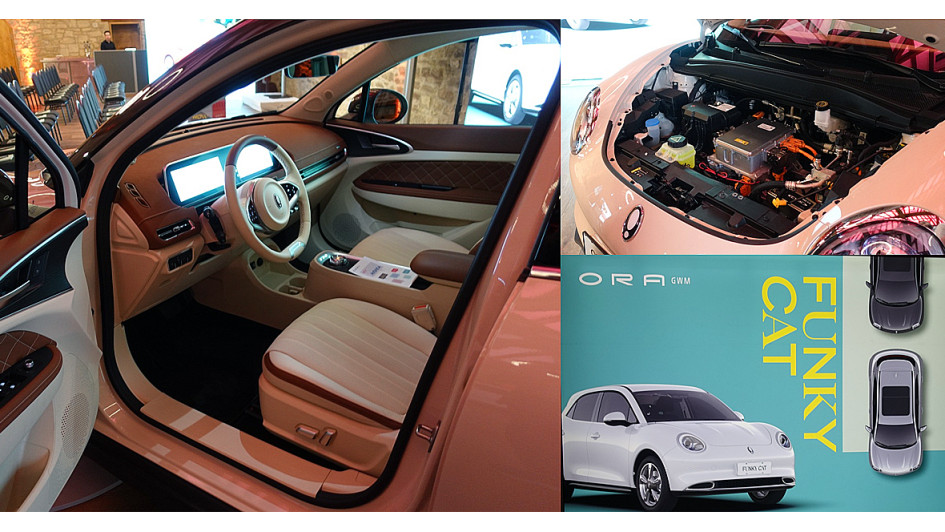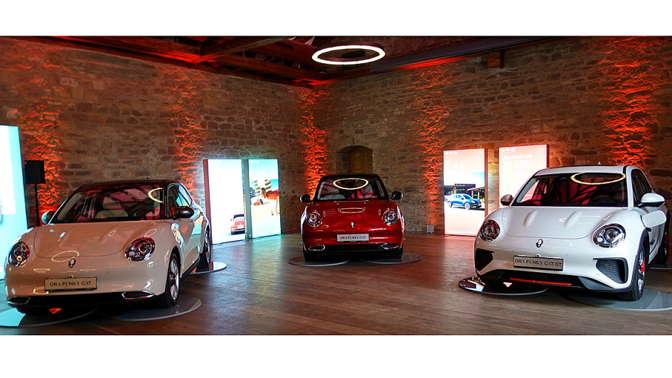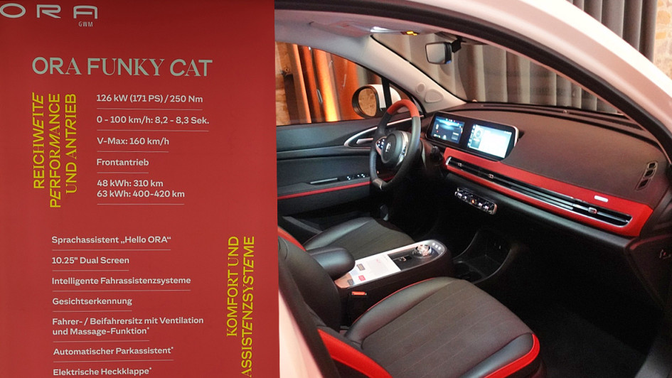 von 6: Diese drei Fahrzeuge standen zur Besichtigung bereit. Das Grundmodell Ora Funky Cat gibt es mit zwei Batterievarianten ab 39.000 Euro, den Funky Cat GT ab 49.000 Euro.