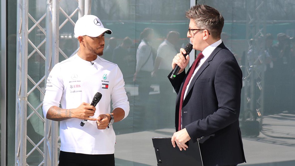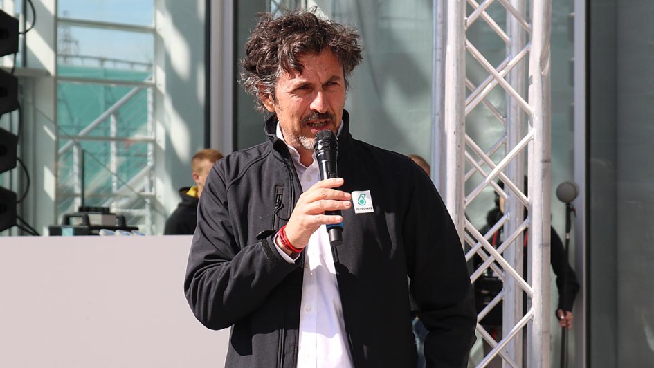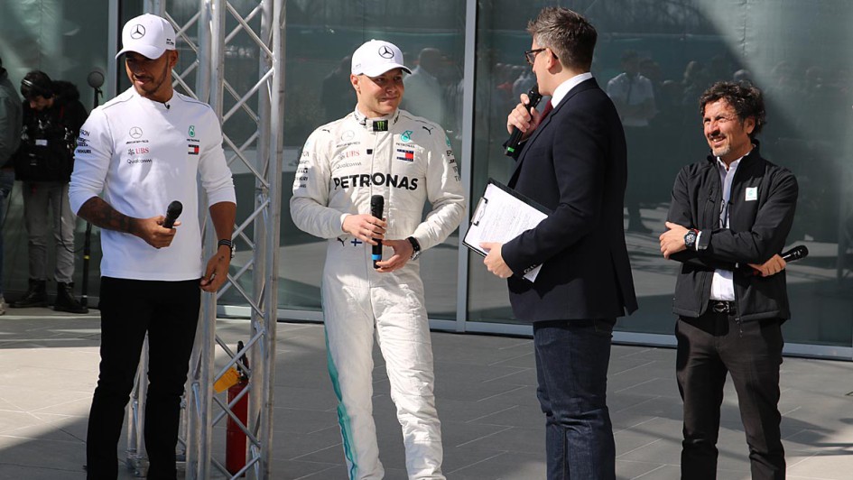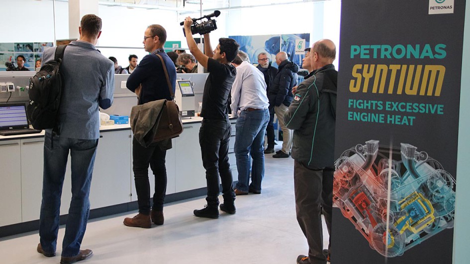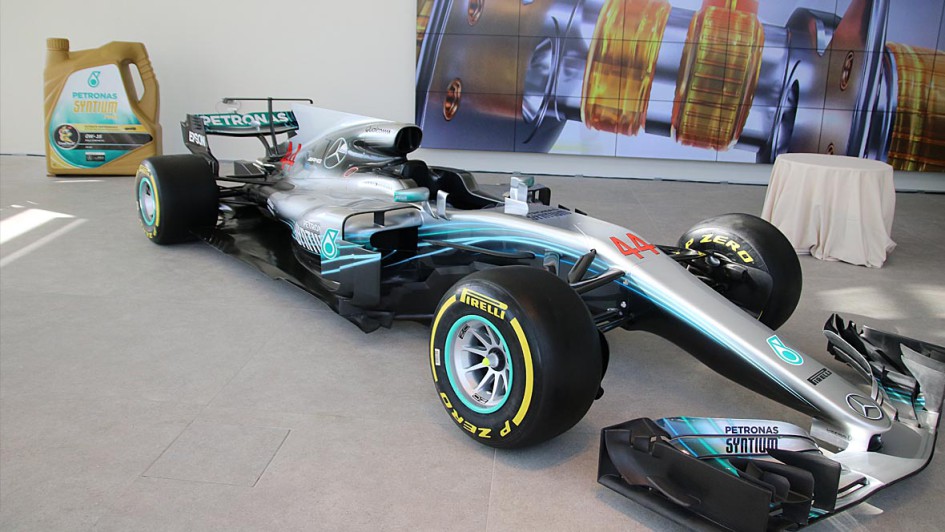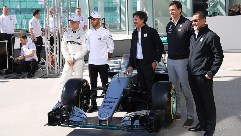 von 9: Gruppenfoto mit Rennwagen (v.l.): Lewis Hamilton, Valtteri Bottas, Giuseppe D’Arragio (CEO PLI), Rennteam-Chef Toto Wolff und Dato Sri Syed Zainal Abidin Syed Mohd Tahir (Petronas Vizepräsident Marketing)