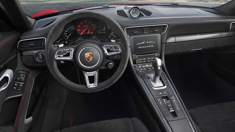 von 7: Zur Serienausstattung des Porsche 911 GTS gehören Alcantara-Sportsitze sowie das Sport-Chrono-Paket mit einer Stoppuhr zentral im Armaturenbrett.