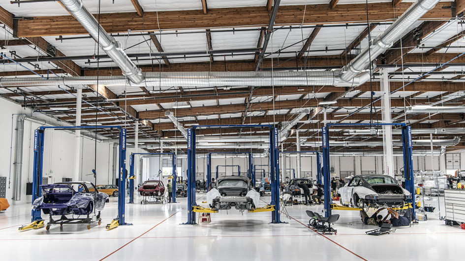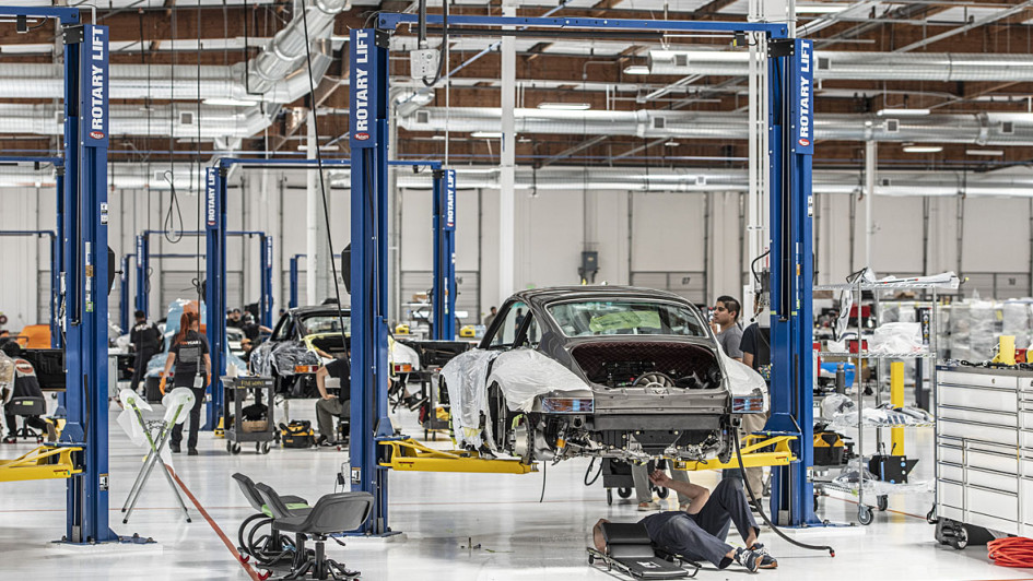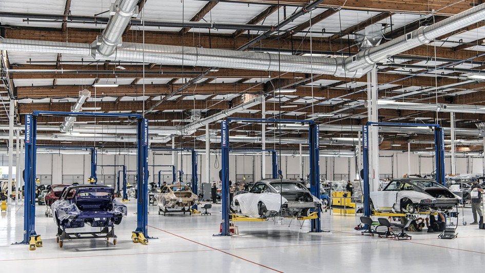von 11: In der großen blitzblanken Werkstatt einen Steinwurf vom Flughafen von Los Angeles entfernt stehen bestimmt zwei Dutzend Porsche 911, die ausgebeint sind.