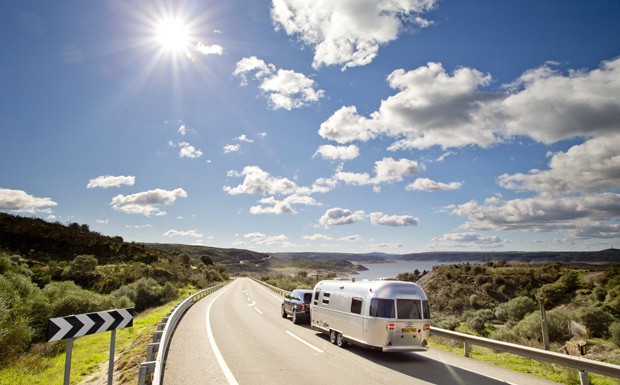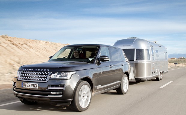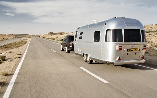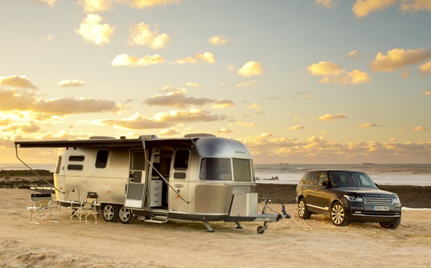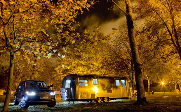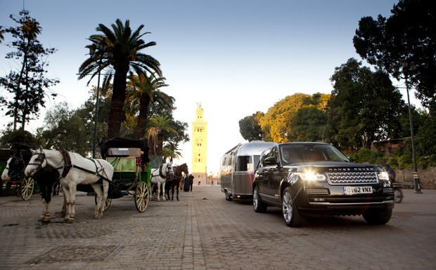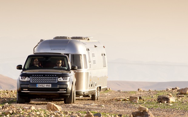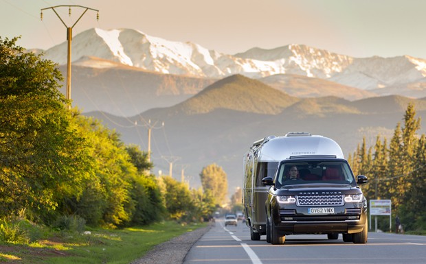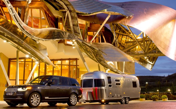 von 10: Alu vor Alu: Das Range-Rover-Airstream-Gespann legt einen Stopp vor Frank Gehrys "Hotel Marques de Riscal" im spanischen Elciego in der Weinbauregion Rioja ein.
