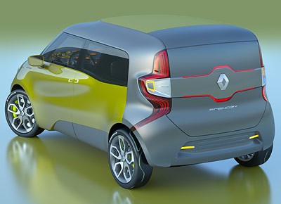 von 5: Den Vortrieb besorgt der aus dem Kangoo Z.E. bekannte 44 kW / 60 PS starke Elektromotor, der den futuristisch aussehenden Kombivan mit der steilen Heckpartie bis auf 130 km/h beschleunigt.