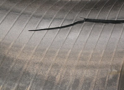 von 10: Klar erkennbar: Ein Bruch bzw. Riss im Bereich der Seitenwandverstärkung. Die Seitenwand des Runflat-Reifens ist grundsätzlich nicht reparabel!