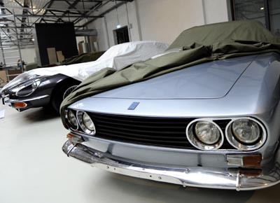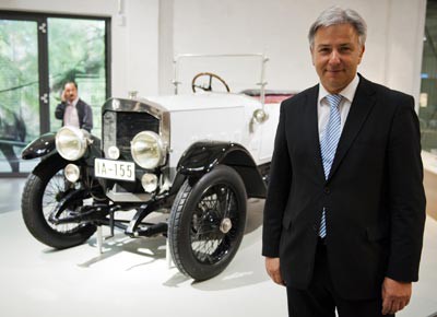von 10: Ein Besucher betrachtet im Deutschen Technikmuseum in der Ausstellung "Mensch in Fahrt - unterwegs mit Auto und Co" ein Spielzeugauto, das zwischen einem Citroen 2 CV (1955, l.) und einer VW Limousine (Exportmodell, 1951, r.) steht.