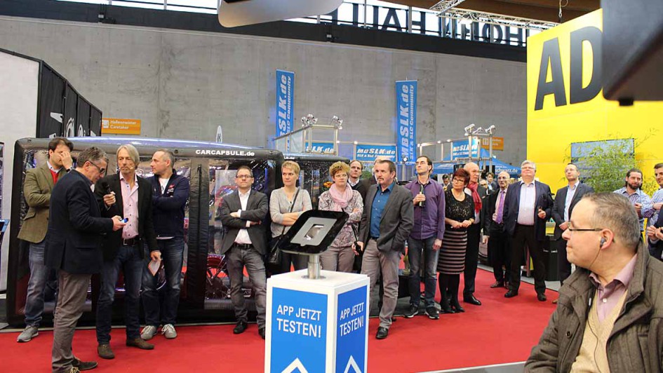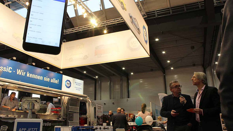 von 5: Kurt Deppert, Vertriebsleiter TÜV SÜD (li). stellte im Gespräch mit Constantin Beims (SWR) sein privates Fuhrparkmanagement über die App vor.