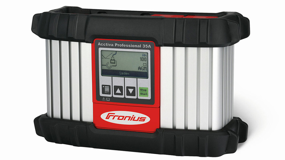 von 4: Fronius Acctiva Professional 35A: Das Fronius-Ladegerät Acctiva Professional 35A (für bis zu 35 Ampere Strom) eignet sich für alle gängigen Batterien und Anwendungen im Profi-Bereich und ist ideal für den Einsatz in Motorrädern, Pkw, Lkw, Einsatzfahrzeugen oder Bussen. Das robuste und kompakte Ladegerät zeichnet sich durch eine praktische Handhabung im mobilen Einsatz sowie eine einfache Bedienung dank großem Grafikdisplay aus. Neben der vollautomatischen Batterieladung verfügt das Gerät über eine Boostfunktion, die zusätzliche Verbraucher erkennt und die Leistung entsprechend erhöht. Es sorgt bei Software-Updates für eine dauerhafte Stromversorgung zum Schutz der Steuergeräte und konstante Spannung bei der Diagnose, um Fehler und Zeitverluste zu vermeiden. Die Schnellladefunktion ermöglicht eine Vollladung auch während kurzer Servicezeiten. Im Stützbetrieb erhält das Gerät die Benutzereinstellungen beim Batteriewechsel, ein Refresh-Modus regeneriert auch tiefentladene Batterien. Spannungen von 6, 12 oder 24 Volt werden bei einer Batteriekapazität bis 350 Amperestunden versorgt.
