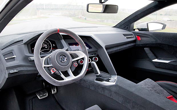 von 5: Im kompakten Innenraum trägt die Designvision unmissverständlich einen kühl-grauen Rennoverall mit Schalensitzen und Karbonoptik für die Oberflächen.