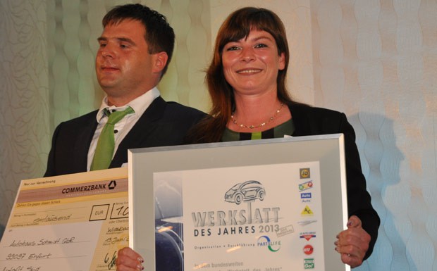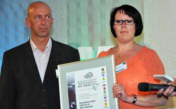 von 18: Platz 1, Kategorie 3: Manuela und Christian Schmidt aus Erfurt freuten sich über die Auszeichnung für ihren Autofit-Betrieb. Hier gefiel der Jury besonders die konsequente Erweiterung des Servicespektrums auf das Thema alternative Antriebe. Autofit Schmidt hat seine Mechaniker frühzeitig für den Umgang mit Hochvolttechnik ausbilden lassen und verkauft das Elektrofahrzeug Karabag 500 (Basis: Fiat 500). Zudem rüstet der Betrieb auf Gasantrieb um.