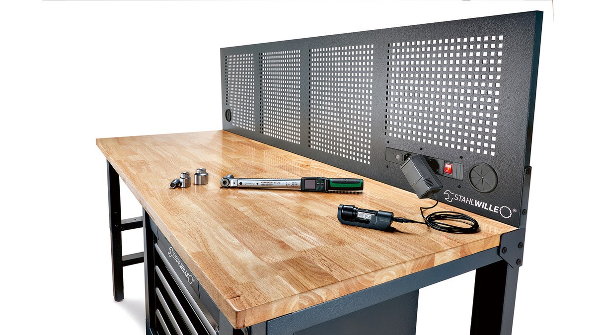 Mit der Werkbank WB 630 ergänzt Stahlwille das Angebot. Das Modell punktet mit einer stabilen, belastbaren Konstruktion, hoher Sicherheit und vielen durchdachten Details. Die 30 mm starke höhenverstellbare Arbeitsplatte der Werkbank besteht aus FSC-zertifiziertem Holz und verfügt über eine Breite von 2.000 mm sowie eine statische Belastbarkeit von 1.000 kg.